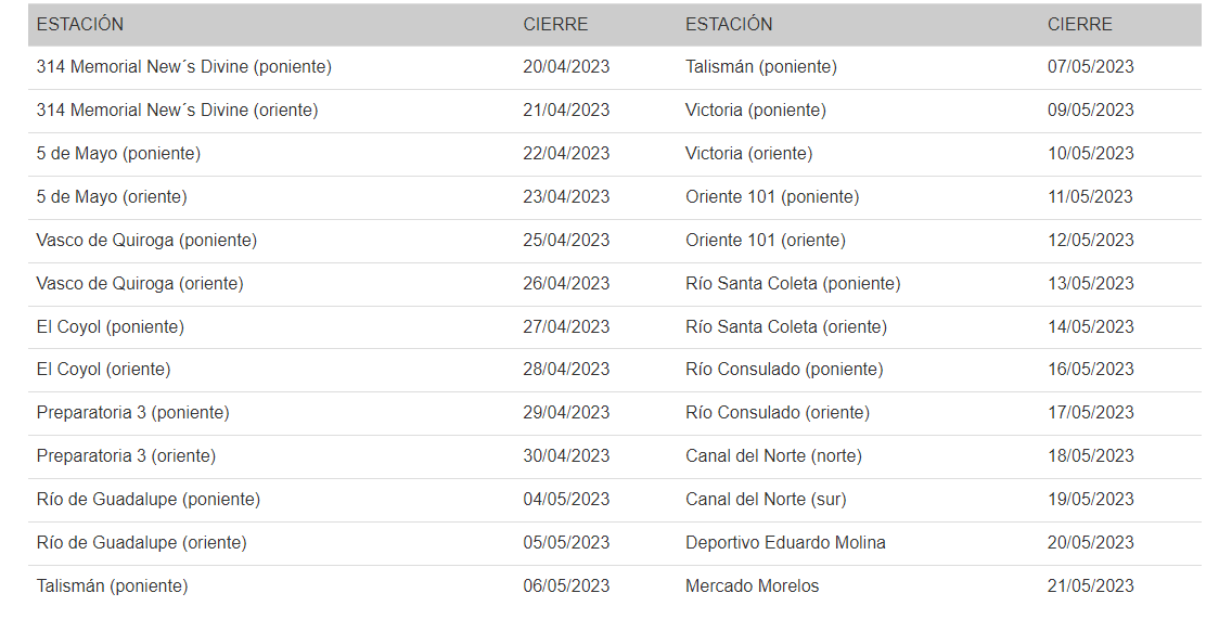 Metrobús comparte las fechas programadas para los cierres correspondientes, para mantener informada a la población usuaria de manera oportuna y que prevea sus trayectos para evitar contratiempos.
