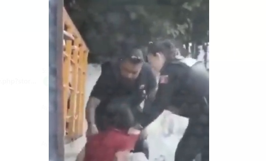 Sin misericordia, la mujer policía (con evidente sobrepeso), pisa una pierna a su víctima, que está sentada e intenta responder a sus cuestionamientos.