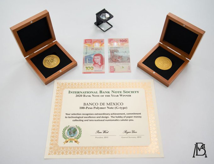 El #BancodeMéxico recibió el reconocimiento por parte de la International Bank Note Society (IBNS) .@theibns por la emisión del #NuevoBillete100 pesos, que fue distinguido como el “Billete del año 2020” pic.twitter.com/hdFa0XNKyA