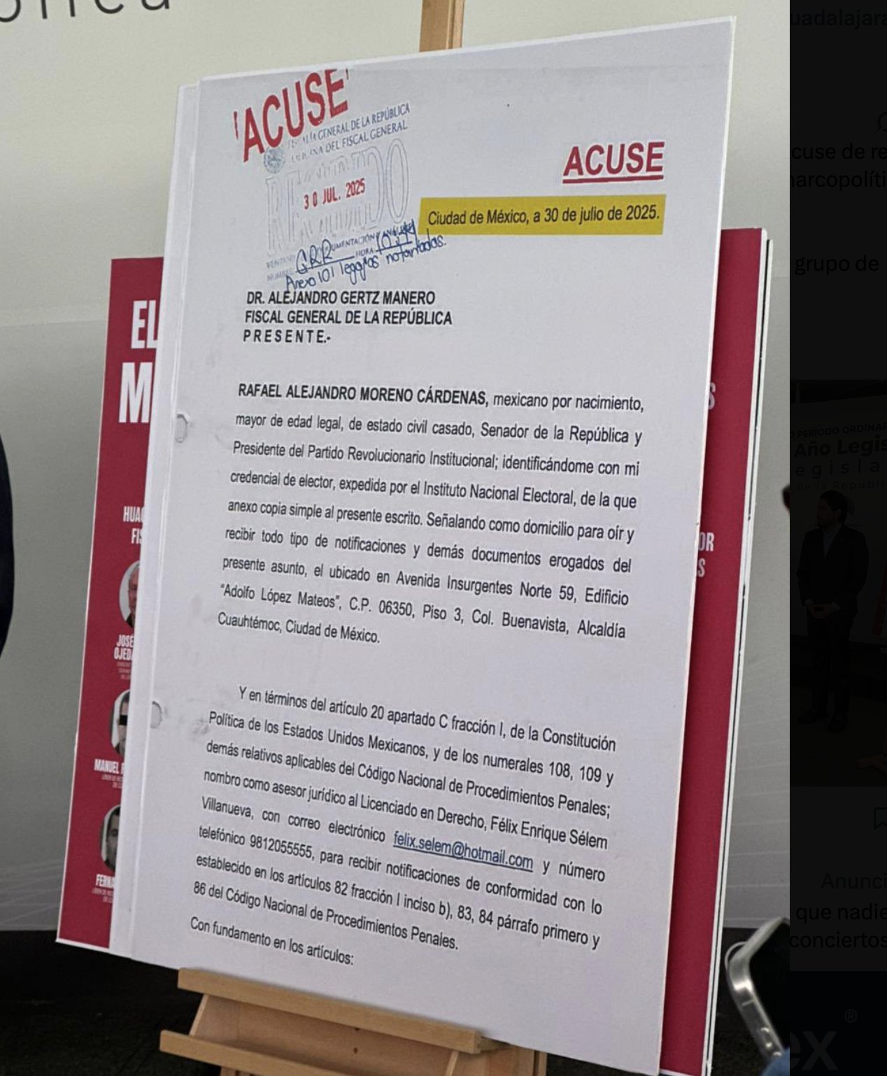 El líder priísta exhibió el acuse de recibo de la denuncia interpuesta ante la FGR, además, solicitó que se le retire el registro como partido político.