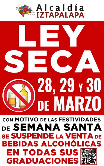Según Acuerdo publicado en la Gaceta Oficial CdMx, , en establecimientos mercantiles de Iztapalapa, se suspenden las actividades relacionadas con la venta de bebidas etílicas en todas sus graduaciones de las 00:00 horas a las 24:00 horas durante los días 28, 29 y 30 de marzo.