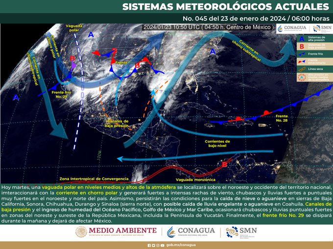La llegada de un Frente Frío 29 de corta duración, provocará lluvias puntuales en el norte del territorio nacional, así como posible nieve o aguanieve en la zonas serranas del norte.