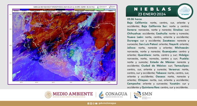 La siguiente imagen satelital muestra bancos de niebla o neblinas en diversas entidades de México