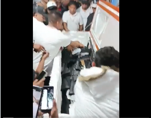Se observa a los presuntos jóvenes integrantes de la organización delictiva, colocando sobre el cadáver del capo y en el ataúd, un arsenal de fusiles, pistolas y hasta granadas, como despedida.