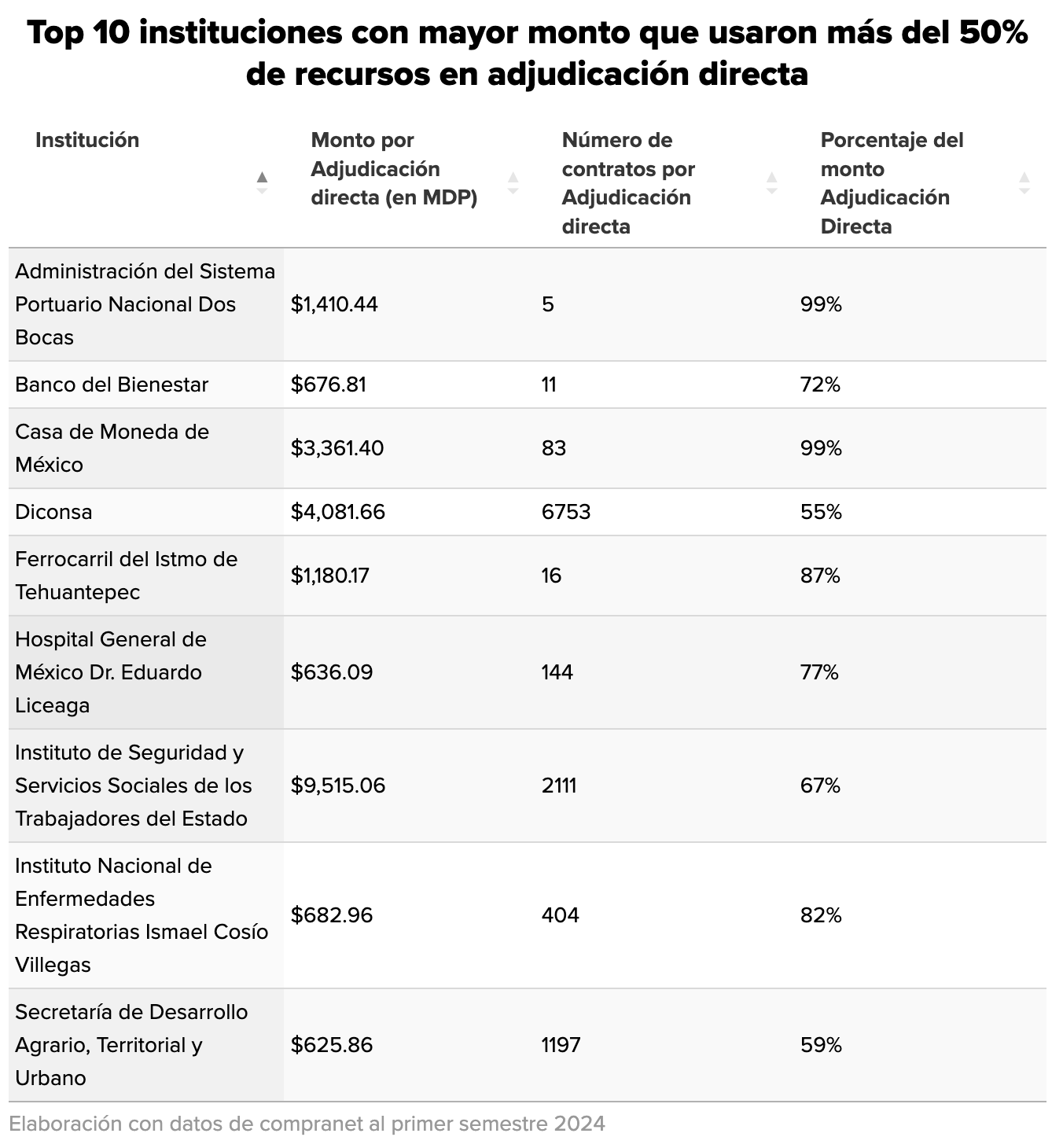 Destacan ​el ISSSTE que ha gastado más de 9 mil millones de pesos en adjudicaciones directas, lo que representa el 67% de los recursos que ha gastado en contratos durante 2024. Seguido de Diconsa que ha gastado en contratos sin competencia más de 4 mil millones de pesos, un 55% de lo que ha contratado ha sido por esta vía. En tercer lugar está la Casa de Moneda de México donde el 99% de sus recursos en contratos fueron por adjudicación directa, acumulando 3 mil millones de pesos.