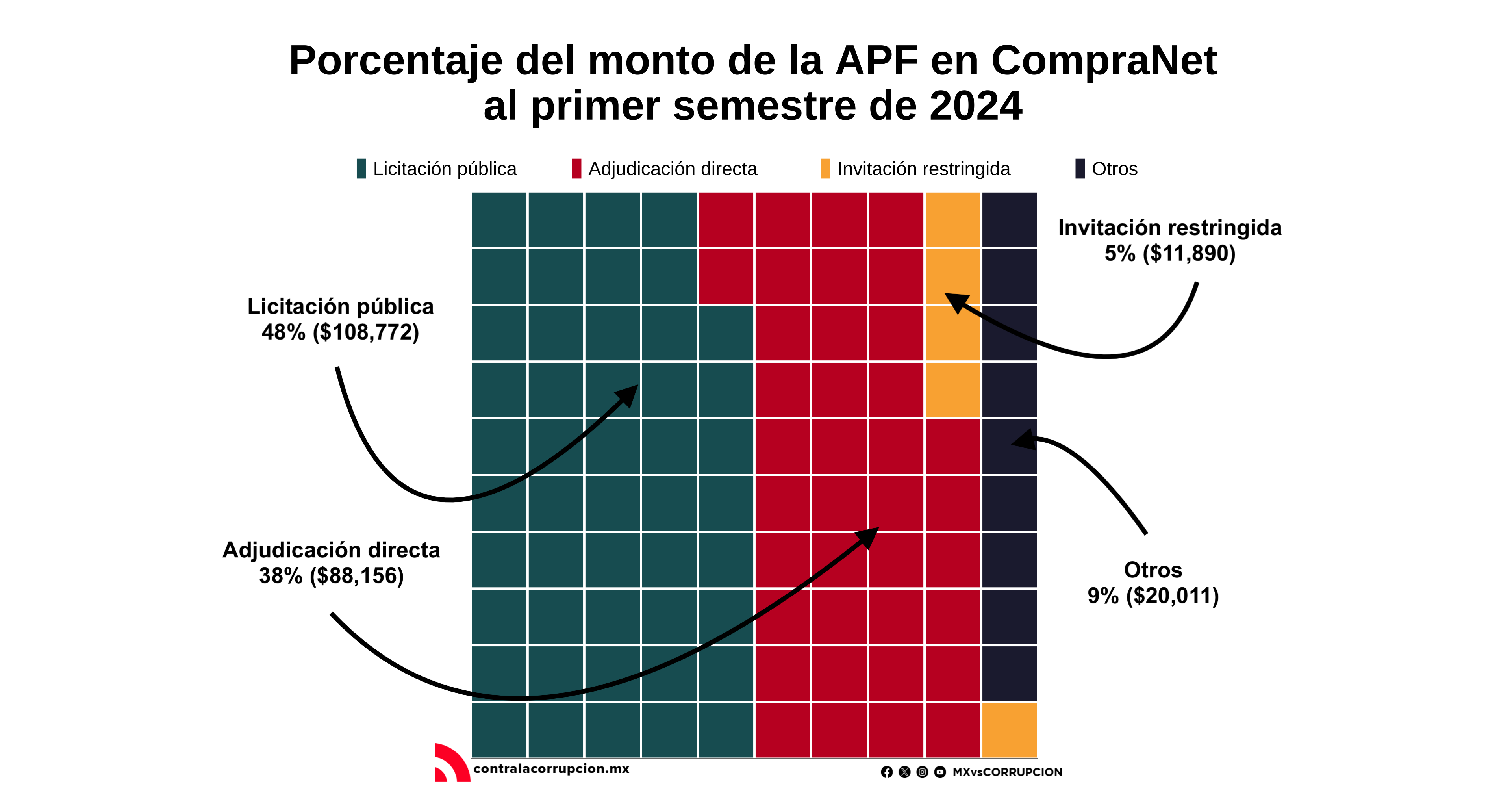 Se gastaron 237,346 millones de pesos en un total de 78,780 contratos. De estos 7 de cada 10 fueron por adjudicación directa, 1 por licitación pública y el resto por invitación a cuando menos tres proveedores y otro tipo de contrataciones, es decir la mayoría son procedimientos que por ley deberían ser solo una excepción.