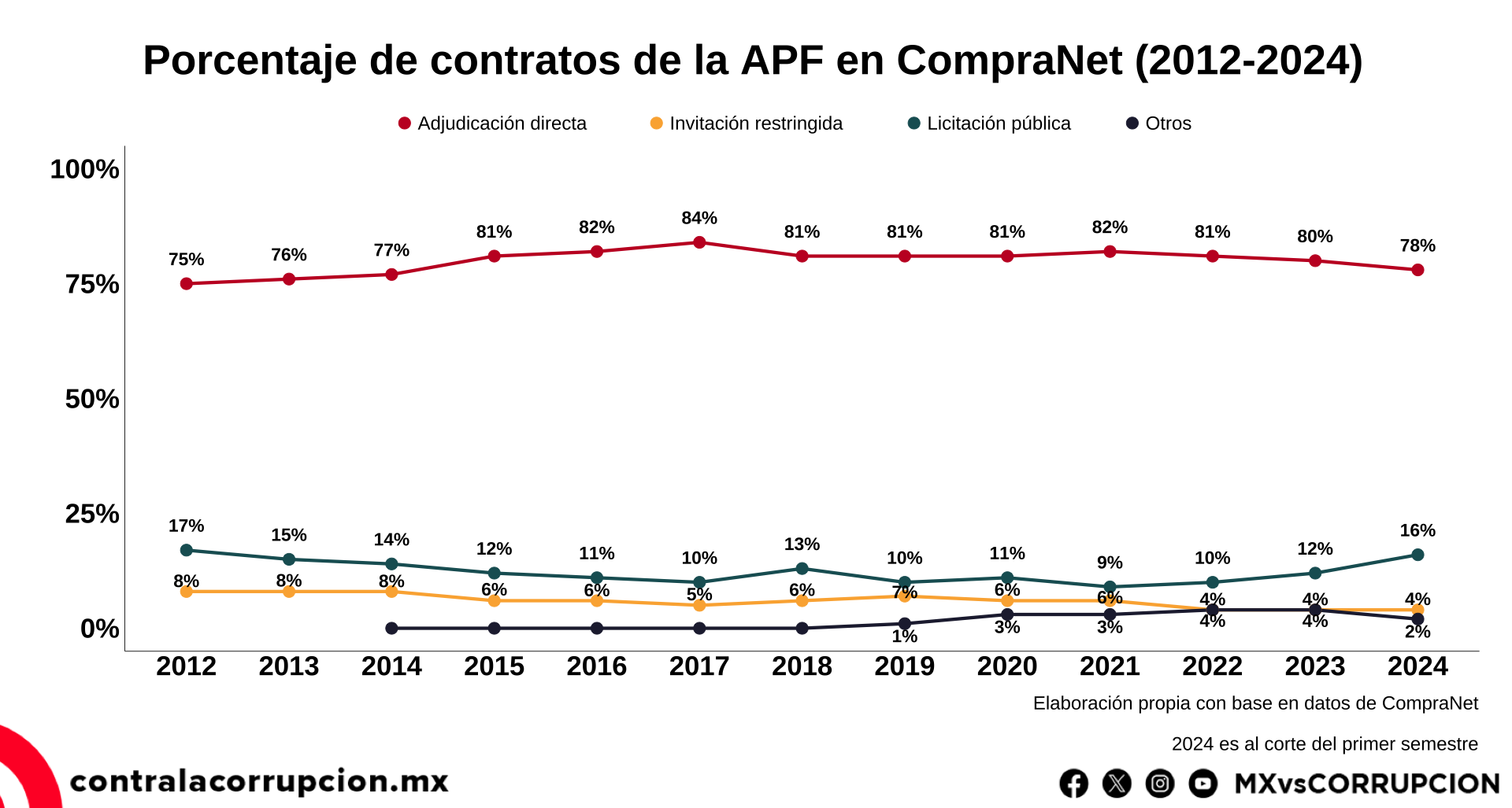 A lo largo del sexenio 2018-2024 identificamos múltiples problemas, irregularidades e ilegalidades en las compras y contrataciones del gobierno federal, desde las caídas y fallas de la plataforma CompraNet, pasando por la persistencia del uso de las adjudicaciones directas en 8 de cada 10 contratos, hasta contrataciones a empresas que legalmente no deberían haber recibido recursos públicos.