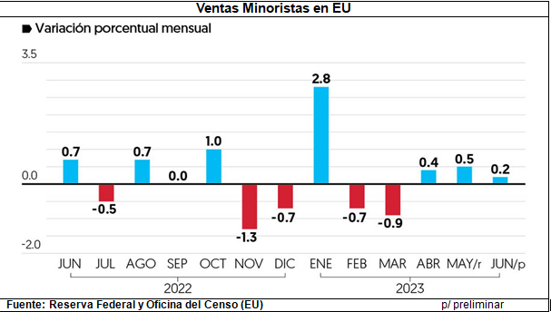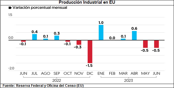 La producción industrial registró un descenso de – 0.5% mensual en junio, similar a la contracción del mes previo, con datos negativos por segundo mes consecutivo; y las ventas establecimientos minoristas crecieron mínimamente a menor ritmo, a sólo 0.2%; estos dos indicadores estratégicos, muestran que hay una significativa desaceleración de la economía norteamericana, que no son suficientes para establecer una recesión hacia septiembre y octubre del año en curso.