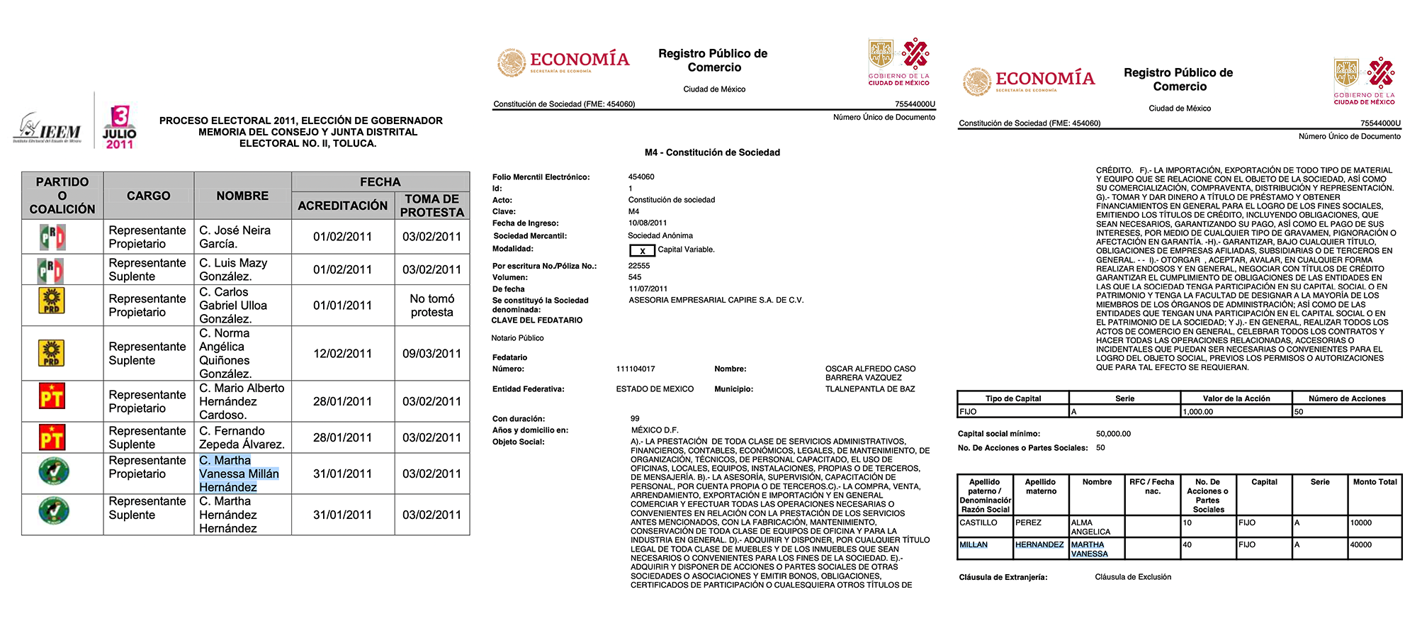 Cuando la empresa fue constituida en 2011, una de sus socias, de nombre Martha Vanessa Millán Hernández, se desempeñaba como representante distrital del PVEM en la elección local del Estado de México, en la que el entonces priísta Eruviel Ávila ganó la gubernatura con el 65% de los votos frente a Alejandro Encinas, actual Subsecretario de Gobernación, quien fue candidato del PRD-PT-Convergencia.