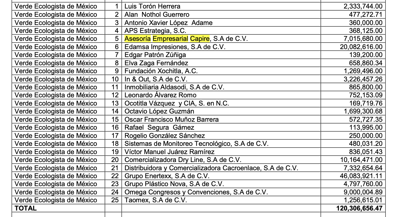 Además de CAPIRE y de Canaima, el PVEM utilizó a otras 35 empresas “fantasma” entre 2014 y 2019 para financiar sus actividades y costear sus gastos de campaña, según reveló el diario El País. En conjunto, a esas otras factureras les pagó 133 millones de pesos.