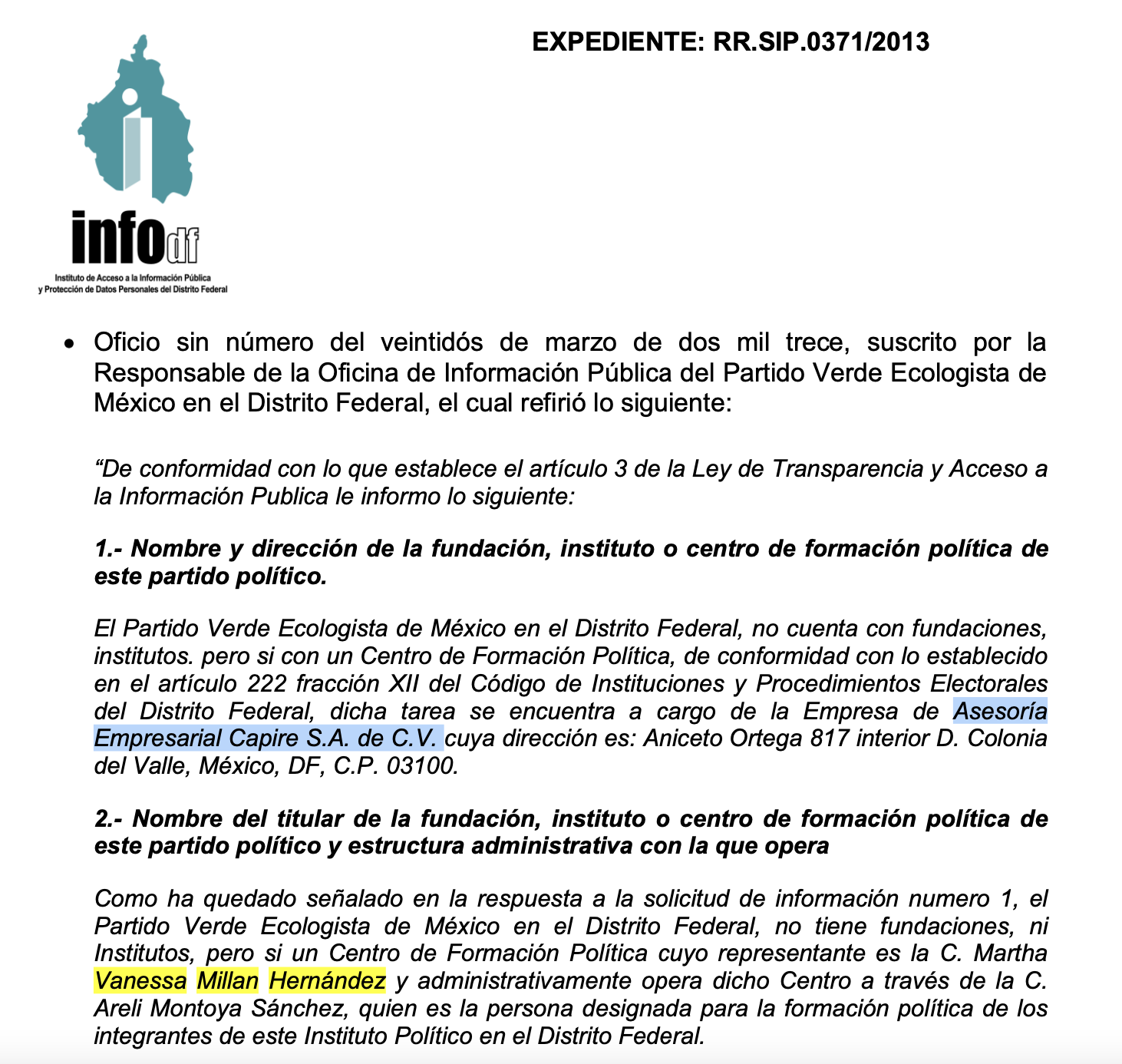 En respuesta, la responsable de la oficina de transparencia del PVEM emitió un oficio en el que informó que CAPIRE cumple la función de centro de formación política. El documento dice textual: