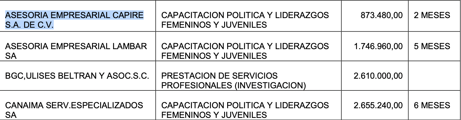 Por el mismo concepto de “capacitación política y liderazgos femeninos y juveniles” con que se contrató a CAPIRE, el PVEM pagó 8.5 millones de pesos entre 2013 y 2014 a Canaima Servicios Especializados, otra empresa que el SAT tiene en su lista definitiva de empresas fantasma.