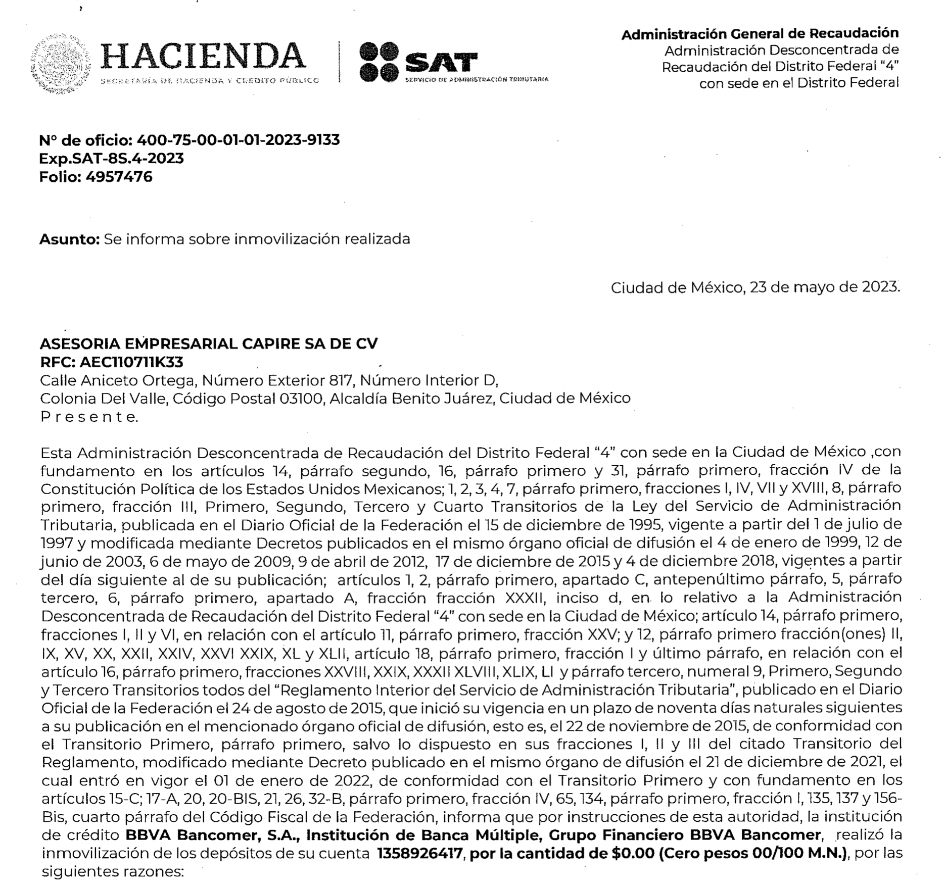 En esa notificación, se informó que por instrucciones del SAT había solicitado a la inmovilización de las cuentas bancarias a nombre de CAPIRE para garantizar el pago del adeudo.