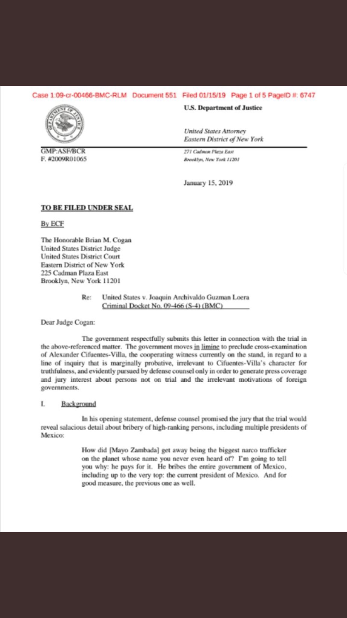 Los fiscales convencieron al juez Brian Cogan para que impidiera a los abogados de El Chapo, interrogar a El Rey sobre López Obrador; no obstante, la acusación de soborno se hizo pública tras el testimonio de Cifuentes.