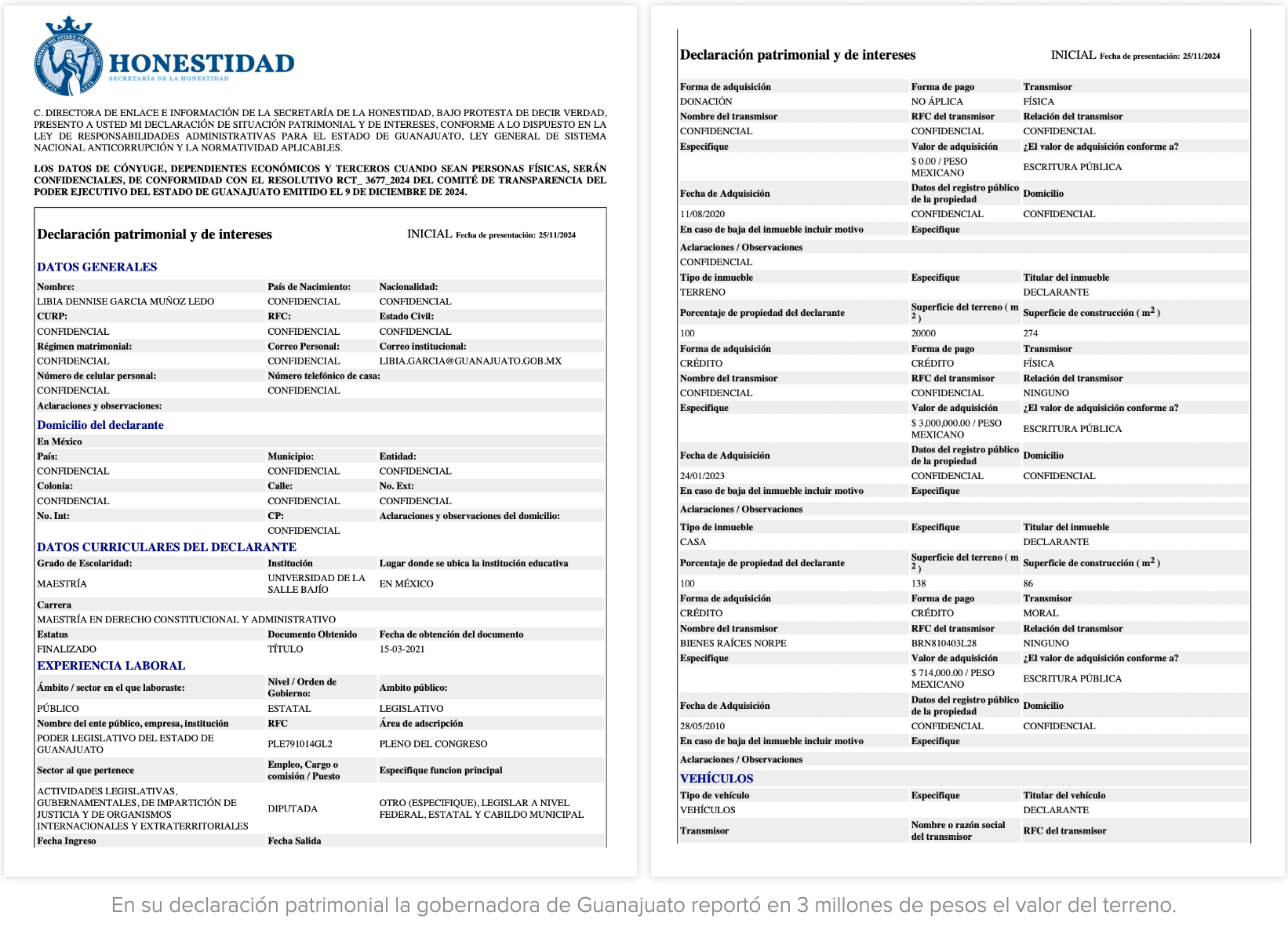 Libia Denisse asumió la gubernatura de Guanajuato el 26 de septiembre de 2024, y dos meses después, el 25 de noviembre del mismo año, presentó su declaración patrimonial en la que reportó a la Secretaría de la Honestidad en el estado que era única dueña del terreno de 20 mil metros cuadrados -del que no dio la ubicación- con valor de adquisición de 3 millones de pesos.
