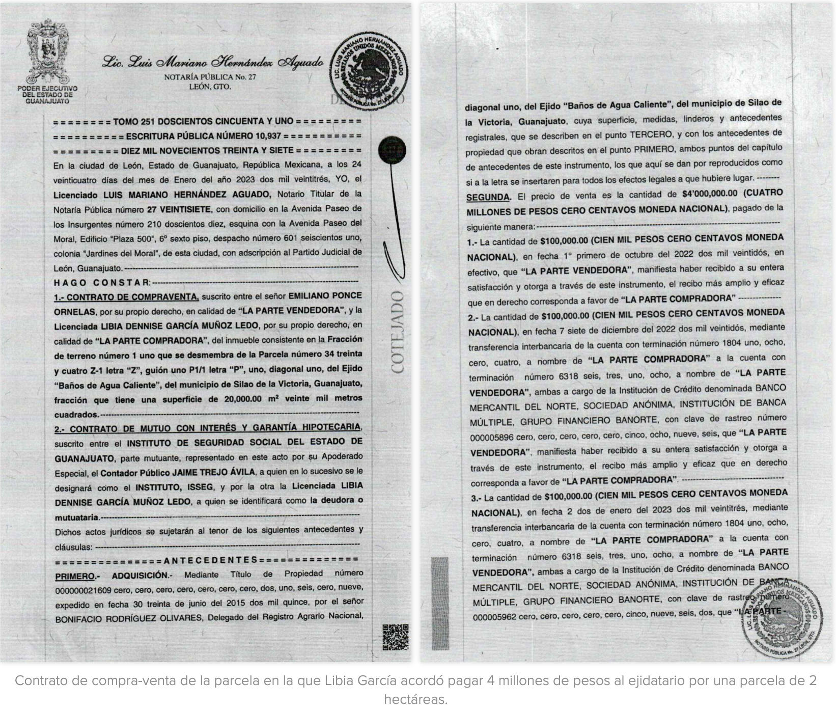 Previo a la firma del contrato, Libia le pagó al ejidatario 100 mil pesos en efectivo y 200 mil pesos por transferencia bancaria. Otros 700 mil pesos fueron cubiertos mediante un préstamo otorgado por Banorte. El mayor monto, por 3 millones de pesos, lo aportó el 16 de enero de 2023 con un crédito del Instituto de Seguridad Social de Guanajuato.