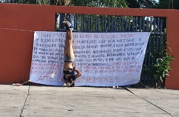 Junto al cuerpo, había una manta de unos cuatro metros. En el mensaje, se señala a la víctima de robo de autos y lanzaron amenazas hacia otros presuntos miembros de un grupo criminal rival.