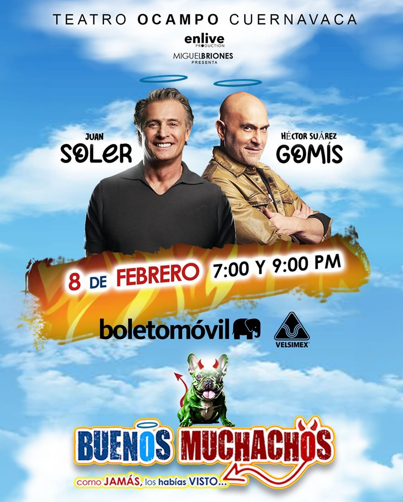 La obra de teatro Buenos Muchachos, escrita, dirigida y protagonizada por Héctor Suárez Gomís, en colaboración con Juan Soler, se presentará en el Teatro Ocampo de Cuernavaca, Morelos, el sábado 8 de febrero, con dos funciones programadas a las 19:00 y 21:00 horas.