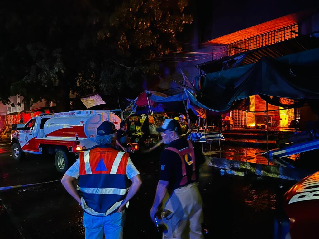 Acapulco, Gro.- Bomberos de la Secretaría de Gestión Integral de Riesgos y Protección Civil (SGIRPCGRO) atienden el incendio que afectó el Mercado Central de Acapulco, en coordinación con vulcanos del municipio del famoso puerto.