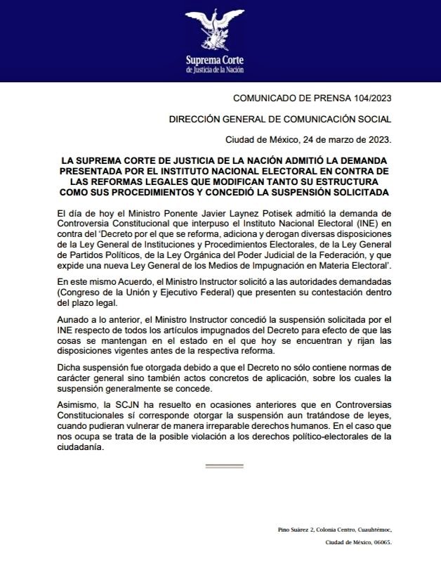 A través de un despacho de prensa, el Poder Judicial indicó que el ministro admitió la demanda de controversia constitucional que interpuso el Instituto Nacional Electoral (INE) en contra de las reformas en materia electoral.