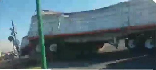 De pronto se ve en las imágenes el cruce de un tráiler y del otro lado, busca pasar otro, de doble remolque. Por supuesto, a éste le será imposible pasar; el tren está cerca y no podrá detenerse.