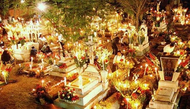 Las tumbas se renuevan y decoran con flores, comida y pan de muerto, agua, sal y diversos elementos, cada uno con un significado especial. Entre rezos y cantos, trascurre la noche en una convivencia de vivos con muertos, mientras la alumbrada guía el camino de los fieles difuntos al Mictlán.
