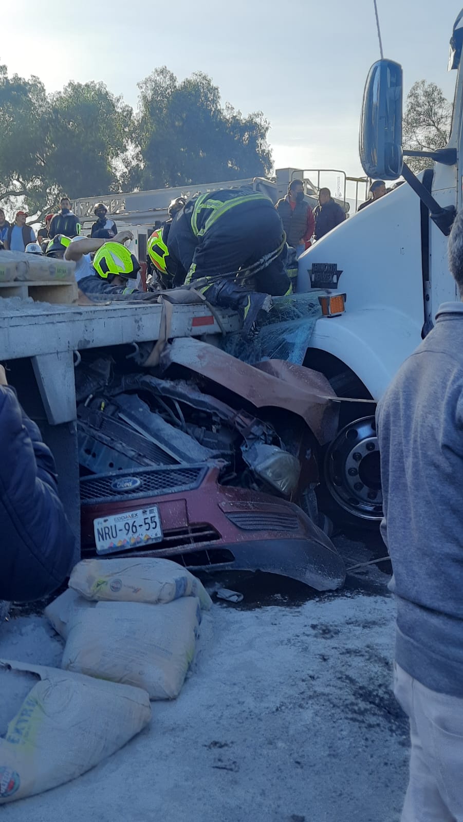 Refieren que la pesada unidad se quedó sin frenos y chocó contra el camión y un automóvil rojo, que quedó prensado contra la plataforma del tráiler que transportaba bultos de cemento.