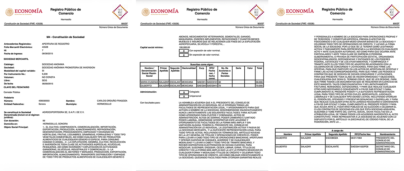 Aunque la causa penal no menciona quiénes son los accionistas o representantes de Agronegocio SE y Agroexportadora SE, MCCI pudo comprobar, mediante una búsqueda en registros mercantiles, que detrás de ellas se encuentra Gilberto Salazar Escoboza, quien preside el Consejo de Administración en ambas empresas. Mientras que sus hijos, María Eugenia y Gilberto Salazar Escalante, son los accionistas de las dos compañías.