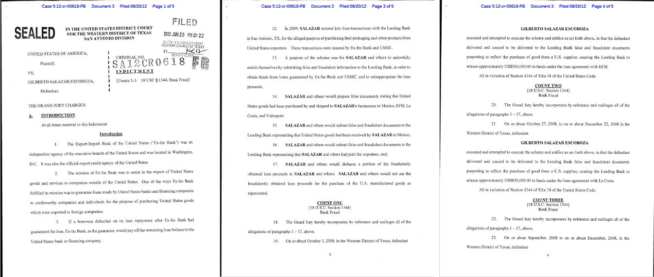 La acusación, presentada por la Oficina del Fiscal Federal del Distrito Oeste de Texas, señala que, entre 2008 y 2009, Salazar Escoboza presentó documentos y cheques falsos afirmando que sus empresas habían comprado y recibido mercancía de la compañía estadounidense Cal-Pine, cuando en realidad dichas operaciones comerciales nunca se realizaron.