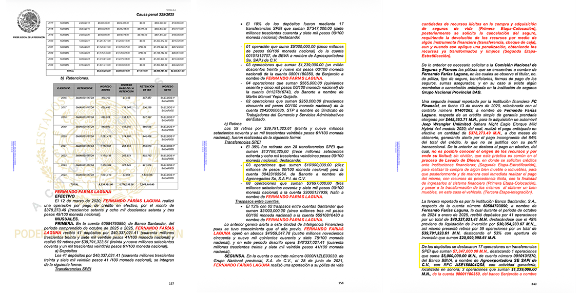 El expediente, al que Mexicanos Contra la Corrupción y la Impunidad (MCCI) tuvo acceso, detalla que, tan solo en 2025, Fernando Farías Laguna recibió 41 depósitos que suman más de 40.3 millones de pesos en sus cuentas personales, entre las que destaca una operación de 5 millones de pesos que Farías Laguna recibió de la empresa Agroexportadora SE.
