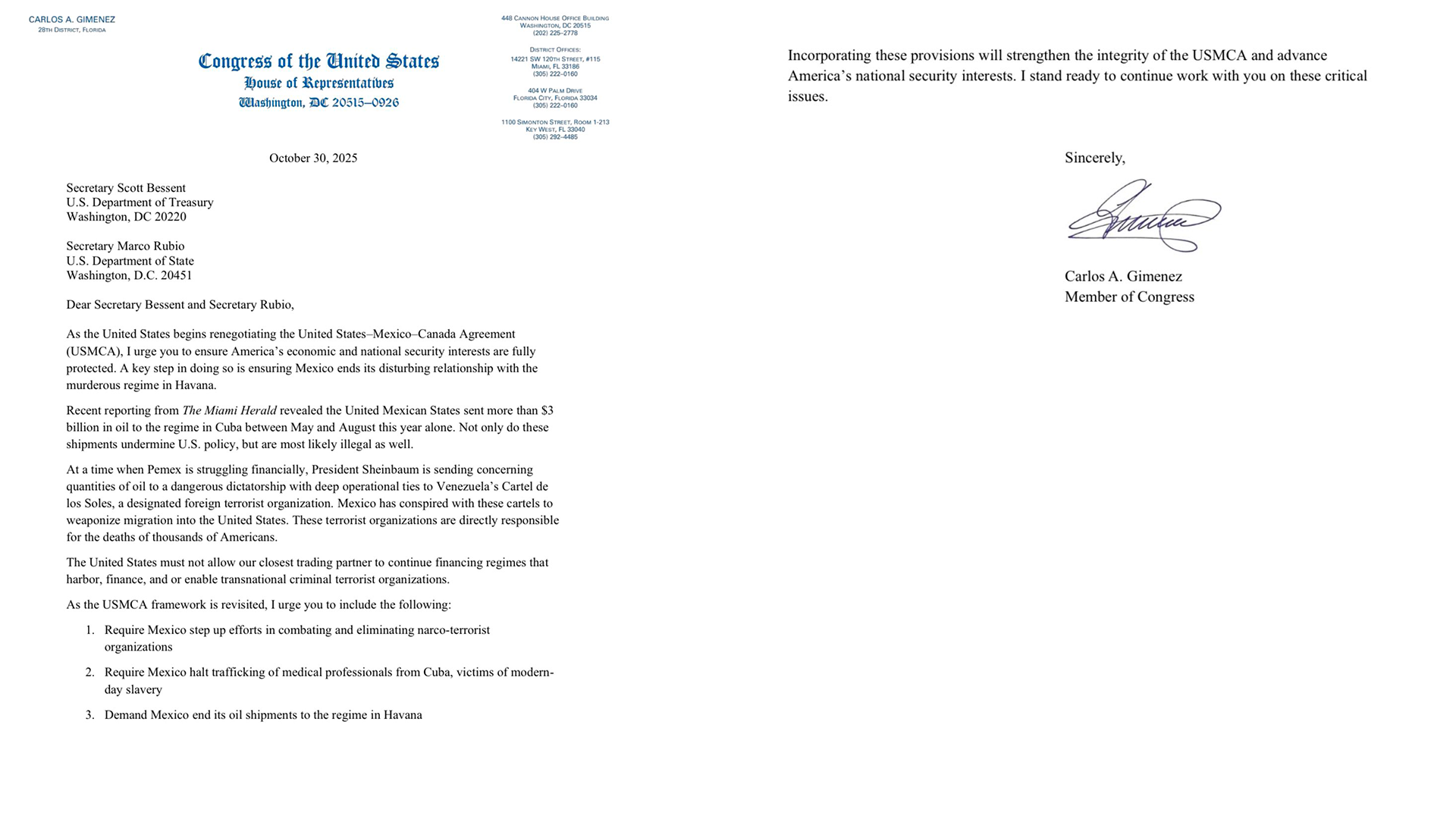 Uno de los principales críticos ha sido el congresista republicano Carlos Giménez, quien reprobó los apoyos del Gobierno de Sheinbaum para oxigenar a la dictadura cubana, y advirtió que éstos podrían afectar la renegociación del T-MEC.