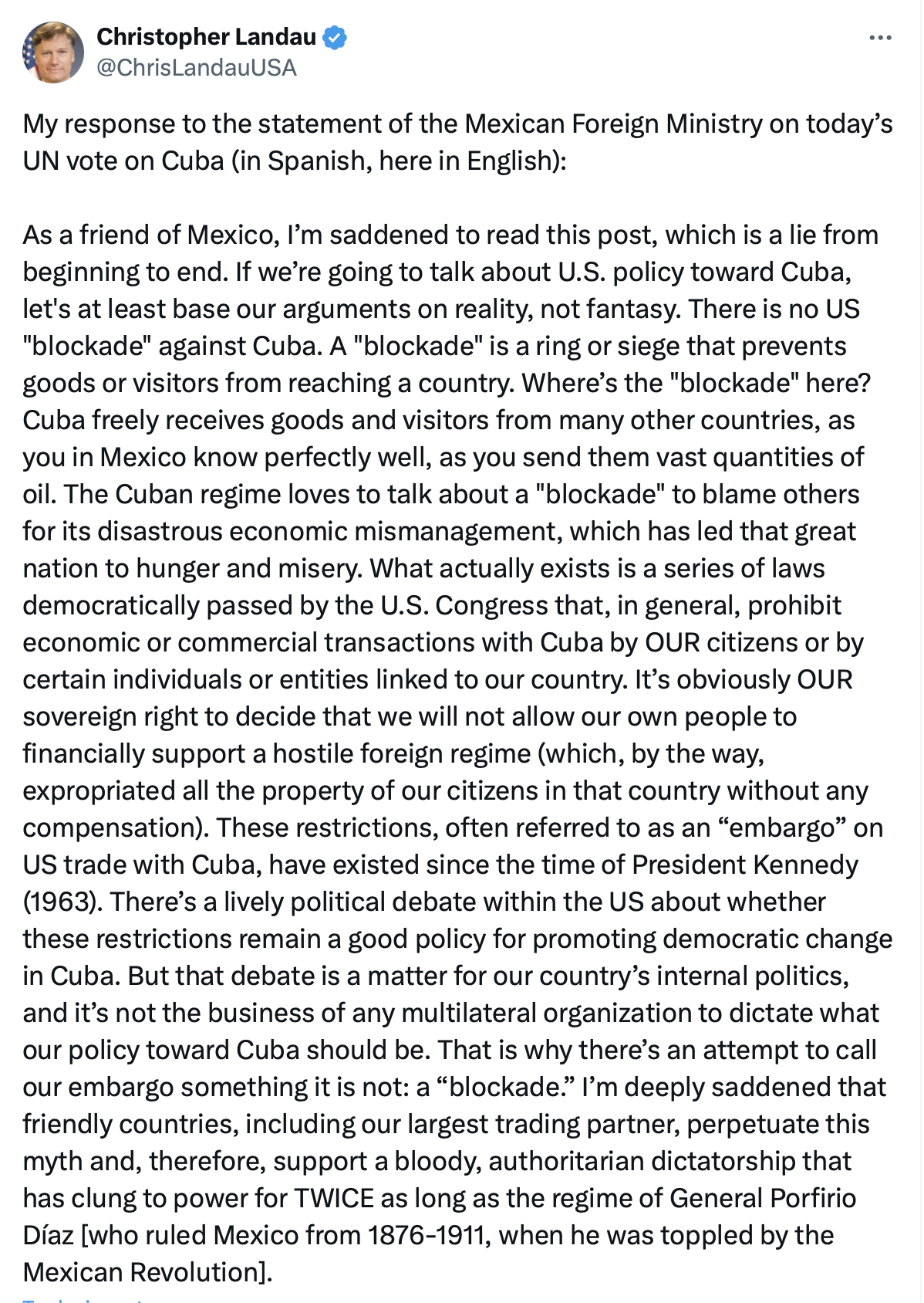 Aunado a ello, el subsecretario de Estado y ex Embajador de Estados Unidos en México, Christopher Landau, se ha pronunciado en múltiples ocasiones sobre los envíos de combustible a Cuba, señalando que eso prueba que no existe ningún bloqueo comercial en su contra, lo que le ha respondido también al mandatario cubano Miguel Díaz-Canel.