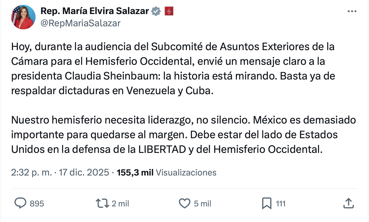 Por su parte, la congresista María Elvira Salazar se refirió al envío de combustibles por más de 3 mil millones de dólares a Cuba e instó a Sheinbaum a frenar los apoyos al régimen cubano.