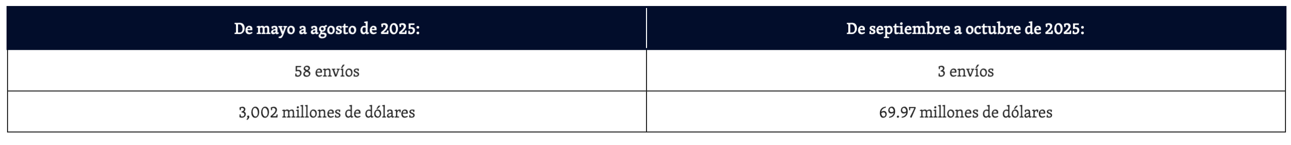 Esta cifra contrasta con los más de 3 mil millones de dólares en combustible subsidiado que el Gobierno de Claudia Sheinbaum exportó a Cuba a través de la empresa filial Gasolinas Bienestar, entre mayo y agosto, y en cuyas operaciones se constató la participación del buque petrolero Sandino, sancionado e incluido en la lista negra de la OFAC, como reveló MCCI el 13 de octubre.