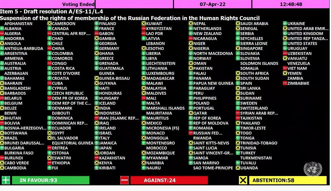 Hoy, Naciones Unidas votó sobre la suspensión de Rusia del Consejo de Derechos Humanos de la ONU. 93 naciones votan a favor de expulsar a #Rusia del Consejo de Derechos Humanos @ONU_es